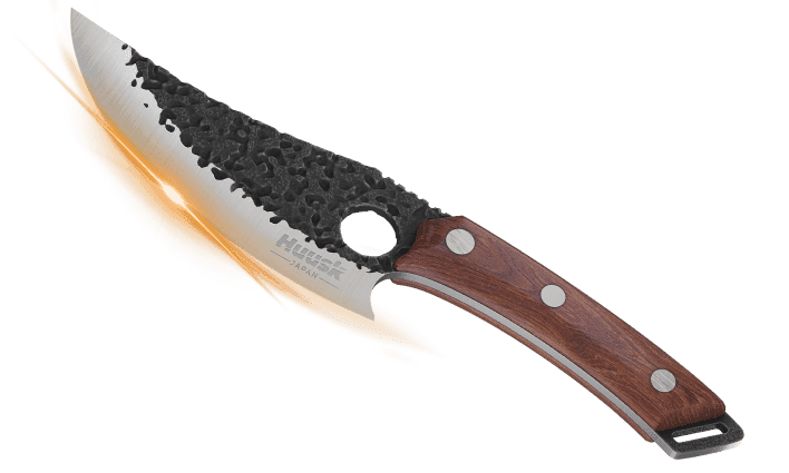 Pisau koki Huusk memiliki lubang jari telunjuk yang pas dan diukir dengan laser demi kendali mumpuni. Mata pisau terbuat dari baja tradisional Jepang yang ketajaman dan kualitas ketahanan pisaunya terjamin. Gagang dari kayu oak premiumnya mungkin merupakan pegangan paling nyaman dan aman yang pernah dibuat.